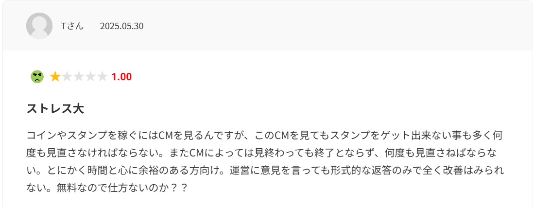 他のポイント獲得サイトやアプリと比較して、ポイント還元率が悪いという評価があります。同じアプリをインストールするなら、別のポイ活サイトのほうがお得という声もあります。さらに、動画を見てもスタンプが付与されない、何度も見直しが必要になるといったシステム上の不備が頻繁に発生しているという報告もあります。こうしたシステム不備と低い還元率が、怪しい印象を強めています。