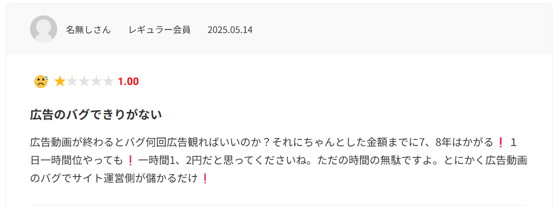 - 報酬が付与されるまで時間がかかったり、出金までの条件や手順がややこしく、「ちゃんと引き出せるのか不安」「換金まで遠い」といった声につながりやすいため。